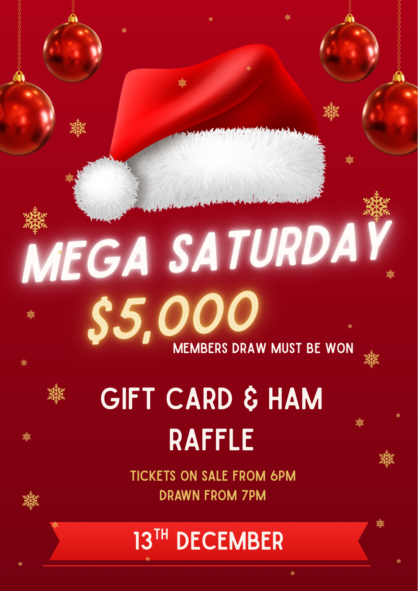Saturday, 13th December. Gift Card and Ham Raffle. $5,000 Members Draw